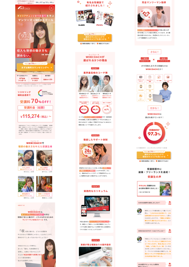 ランディングページ制作 2025年7月13日 最終更新日時 : 2025年7月13日 Portforio 【製作時間】20時間【使用ソフト】Photoshop・illustrator・Figma・HTML・CSS・jquery【担当業務】デザイン・実装【意識した亊】スクロール離脱を防ぐためjqueryで動きをつけたLPを作成しました。